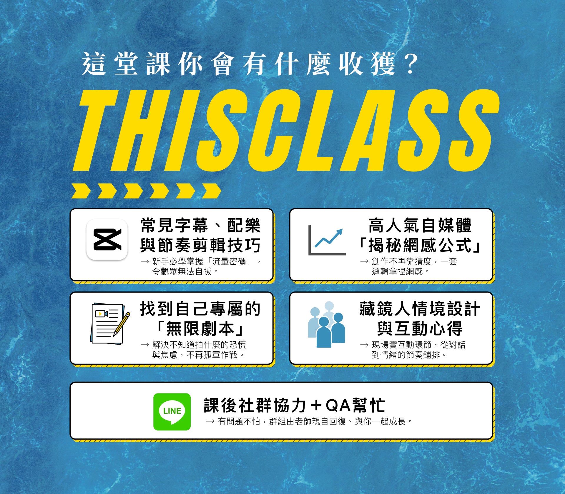 從定位×腳本 × 拍攝 × 分鏡,酷炫老師親自指導、實際產出並且帶回家。
